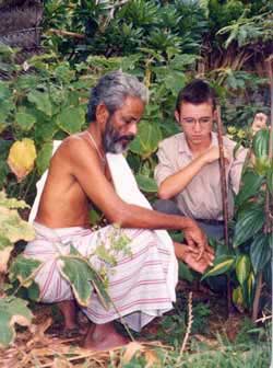 | Farmer Tennekoon shows Theo a variety of betel leaf called Naga Valli. Long ago when Naga (serpentine) spirits visited this world they brought with them their favorite variety of betel leaf (chewed with lime paste and arecanut) as an offering to the humans who were living in Lanka at the time. The whole Samudra Cottage garden was planted with indigenous plants as seen in the photo. Theo came for three months in 1991 at age 15 on Cultural Survival's Discover Lanka educational program. | ![]() |