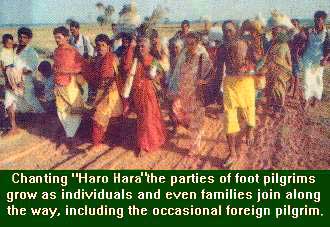 The traditional pada yatra it is said, starts from the ground beneath one's feet, from one's own doorstep or wherever one happens to be when the divine 'call' comes. Starting from our shadowy world of deceptive appearance, the pilgrim's feet keep to the ground even while he or she is making steady progress to the Kingdom of Katir-Kamam, the realm of light and love that exists always in the eternal here and now. As they walk to Kataragama, the traditional pilgrims commonly undertake simple vows of self-denial, thereby affirming their submission to the one and only reality that each understands differently. Thus, one may stop smoking while another may keep a vow of silence. By ancient right, this acceptance, of austerities in the name of a higher principle entitles them to be addressed as swami (lord) or amma (lady). The mere sight of these pilgrims is said to bestow subtle blessings upon whole communities. And yet the pilgrims reckon themselves to be cinna alkal, 'little people' or adiyarkal, Literally slaves to their Lord. Such pilgrims have traditionally accepted the role of beggars, for traditional has it that Kataragama Skanda, their gurunathan, also walked to Kataragama in the guise of an andi or itinerant beggar. Portrayed in poetry and legends as an ever-youthful master of magic, strategy and surprise, Kataragama Skanda (alias Andi Guru) has provided inspiration for uncounted generations, of storytellers and minstrels. Small wonder that the great spirit of Kataragama, the Kande Yakka of age-old Vedda lore, still enthrals the hearts of millions even into the 21st century. Longest pilgrimageOf all the pilgrimage routes in Sri Lanka, the longest is that from the Jaffna peninsula to Kataragama in the far South. Because the celebrated pada yatra route hugs the eastern seaboard it is also called the Kathira Malai Karai Yatirai or 'coastal pilgrimage to the brilliant peak'. As its name suggest, it is a tradition dating from remote times when Kataragama peak itself was the principal focus of worship. A long trek lies before those who start from the far north. Nearly two months before the great Esala festival in Kataragama, individual pilgrims gather at sacred sites such as Naga Deepa, Nallur or Selva Sannithi to take there solemn vows. Then with a loud chorus of Haro Haro! they proceed as onlookers pause to cheer them on. Generally a swami among them bears with dignity the god's Vel or lance emblem. At least 73 major temples and shrines line the way to Kataragama, and the pilgrims stop at each of them to offer respects. By Poson Poya Day pilgrims assemble at the Vattappalai Kanakki Amman kovil near Mullaitivu for the great Amman festival 45 days before the flag hoistiting at Kataragama. Even as the kap hitaweema ritual of promise is being performed at the Mahadevale in Kataragama, pilgrims are offering at Vattappalai. From there the ritual festivity continues all 45 days to Kataragama. Poets, ministrels, musicians dancers, clowns and ecstatics are spread like a leaven through the concourse as they move in parties often separated from each other and appearing to walk alone across the awe-inspiring landscapes of Sri Lanka. At night there is the welcome glow of campfires, much sharing of food, frequent outbursts of laughter, almost continuous chanting of praise and, of course, the spectacle of wisdom teaching being rehearsed by the elders in the form of stories, songs and dramatic presentations. As late as the 1970's the rank of pilgrims walking southwards would swell to over a thousand singing devotees. People residing along pada yatra routes would anticipate the pilgrims annual arrival, and whole villages would turn out to fete them with food and entertainment offered to the gods and their 'messagers' the pilgrims. Day and night the air would resound with music and laughter. At times, the traditional hospitality could be so overwhelming that pilgrims had to excuse themselves and move on. Along by local residents with offering of cool water, buttermilk or tender coconut to relieve the thirst and discomfort of walking for miles under the scorching tropical sun. The final 60 miles of the journey take the intrepid pilgrims through wild jungle teeming with herds of elephant, deer, sambur, boar and more. Typically the jungle would claim the life of one or more pilgrims who succumb to fever, wild animals or simply get. Those who have pass through, however, bring home stories and memories of night by the campfire under an open sky that will last a lifetime. Changing times and social disruptions nearly put and end to the pada yatra, in the early 1980's. But in 1988, Muttu Kumar Vel Swami, a veteran of over fifty pada yatras, called for earnest devotees to walk with him once again. With the support of the newly created Kataragama Devotees Trust, the pada yatra tradition was not only successfully revived but attracted media coverage in Sri Lanka, India and even in America. In 1988 and succeeding years. Vel Swami led the pada yatra pilgrims through the fear-ridden atmosphere of regions torn by ethnic strife. Never before had such hardship confronted the pilgrims as in those difficult years. Alms-begging, an age-old pada yatra ritual, played a vital role in fending off hunger when there was no organized offering of dana. Even jawans of the Indians Peace Keeping Force and Sri Lanka security forces made offering of puja and prasadam to Lord Skanda and his faithful devotees those days. All the way to Kataragama, offerings are accepted with gratitude, generating goodwill all around. Even with conflict raging in the 1990's hundreds of pilgrims continue to experience the joys and hardships of pada yatra. This year also, despite most adverse conditions, hundreds of devotees will walk again. Some will arrive in time for the flag-hoisting on July 5 while other will come in time for the tirtham or water-cutting ceremony on July 20.