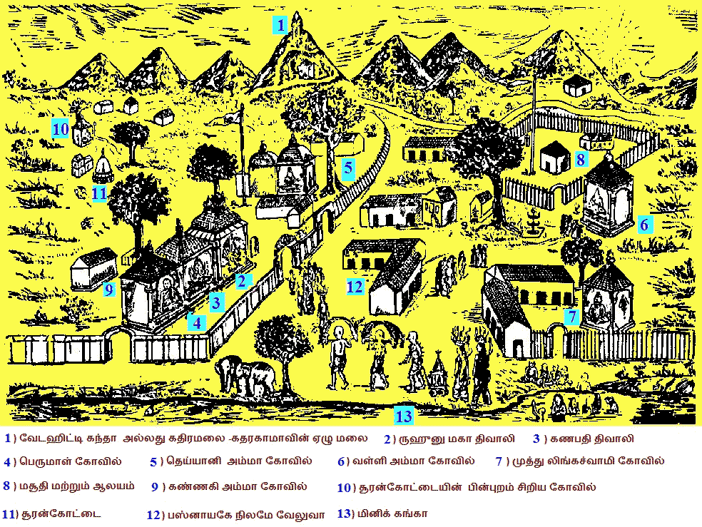 ஸ்ரீலங்காவில் இருந்து மட்டும் அல்ல தொலை தூர இந்தியப் பகுதிகளில் இருந்தும் பக்தர்கள் வந்து வணங்கிய புனித யாத்திரைப் பகுதியாக கதிர்காமன் இருந்ததாம். அந்த ஆலயத்தைத் தவிற வேறு சில கட்டிடங்களும் ஆலயத்தின் அருகில் இருந்தது. அவற்றைத் தவிற அங்கு கதிர்காம திவாலி (கூடம்) , கணேஷ் திவாலி மற்றும் புத்த விஹார் போன்றவைகளும் கவனிப்பார் அற்று இருக்க அவற்றைத் தவிர ஆறு சிறிய ஆலயங்களும் 'பட்னி' மற்றும் பிற ஐந்து தெய்வங்களுக்கு அற்பணிக்கப்பட்டு இருந்தன. அவற்றின் நடுப் பகுதியில் சிவன், பைரவர் போன்றவர்களுக்கு சன்னதிகள், பயணிகள் தங்கும் இடம், பிற அலுவலக அறைகள் போன்றவை இருந்தன. 'கதிர்காம திவாலே' என்பது இரண்டு பிரிவுகளாக இருந்தன. அவற்றில் வெளியில் இருந்த அறைதான் உள்ளே நுழைய முடியும் நிலையில் இருந்தது. அங்கிருந்த சுவர்களில் வரலாற்று சிறப்பு மிக்கக் காட்சிகள் மற்றும் தெய்வங்களின் சித்திரங்கள் காணப்பட்டன. அதன் மேல்கூரையின் மீது வண்ணம் பூசப்பட்ட விசித்திரமாக துணி காணப்பட்டது. கதிர்காமத்தின் முக்கியமான இடம் அங்குள்ள கல்யாண மடம் ஆகும். அது தரை மட்டத்தில் இருந்து உயரமான நிலையில் உள்ளபடி களிமண்ணினால் கட்டப்பட்டு, கால் இல்லாத ஒரு நாற்காலி போல, ஆனால் பின் புறத்தில் தடுப்பு உள்ள நிலையில் அமைக்கப்பட்டு உள்ளது. அதன் இருக்கை புலித் தோல்களினால் மூடப்பட்டு, ஆலய உற்சவங்களில உபயோகிக்கப்படும் வாத்தியங்களை வைத்துள்ளது போல அமைக்கப்பட்டு உள்ளது. அதன் பக்கத்தில் எப்பொழுதும் எரிந்து கொண்டிந்த பெரிய ஹோம குண்டமும் உள்ளது. அங்கு வசிக்கும் பிராமணர்கள் அந்த கல்யாண மடம் கல்யாண நாதா என்பவருக்கு சொந்தமாக இருந்தது என்று கூறுகிறார்கள். அந்த ஆலயத்தை சுற்றி ஆலயத்திற்கு சொந்தமான பல கிராமங்கள் உண்டு. அந்த இடங்களில் வசித்தவர்கள் அந்த நிலங்களில் வேலை செய்பவர்கள். ஆலயத்தில் உள்ள பண்டிதர்கள், அரசாங்க அதிகாரிகளைத் தவிற பன்னிரண்டு 'கபூரலாக்கள்' என அழைக்கப்படுபவர்கள்' பஸ்னாயகா நிலாமே' என்ற அதிகாரியின் மேற் பார்வையில் இயங்குகின்றனர். 1815 ஆம் ஆண்டு முதல் பிரிடிஷ் அரசு அந்த நாட்டை தன் கட்டுக் கோப்புக்குள் எடுத்துக் கொண்ட பின் ஆலய யாத்திரையை மேற் கொண்ட பக்தர்கள் அங்கு செல்வது பெரும் அளவில் குறைந்து போயிற்று.