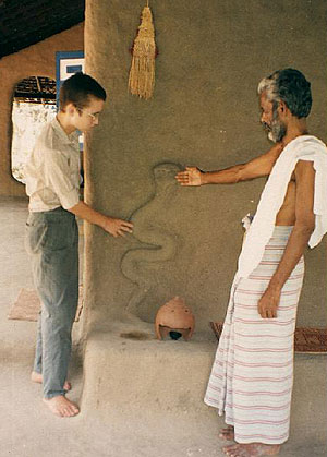 "I showed Theo the special variety of betel leaf that we grow in the cottage garden, called Nagavalli. When Naga Rajah, the king of the Naga ('serpent') world, left that world and came to ours, he landed here on Nagadeepa (Sri Lanka) and made an offering of Nagavalli to Mother Earth. You can't buy it in the marketplace; it is only for domestic use."